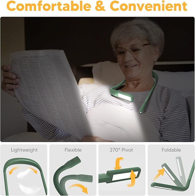 - Indoor Use for Reading or Crafting: Envision those quiet evenings lost in a good book. Our Neck Light provides tranquil 'me time,' gently illuminating your pages without interruption. Perfect for moms, grandmas, and wives who cherish crafting—whether it’s knitting, crocheting, sewing, quilting, embroidery, needlepoint, or cross-stitching—the light is soft on the eyes while providing clear visibility for fine detail. Plus,it serves as a emergency light for power outages or a soothing night light