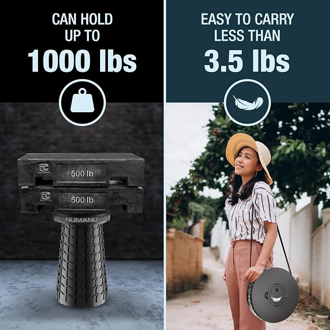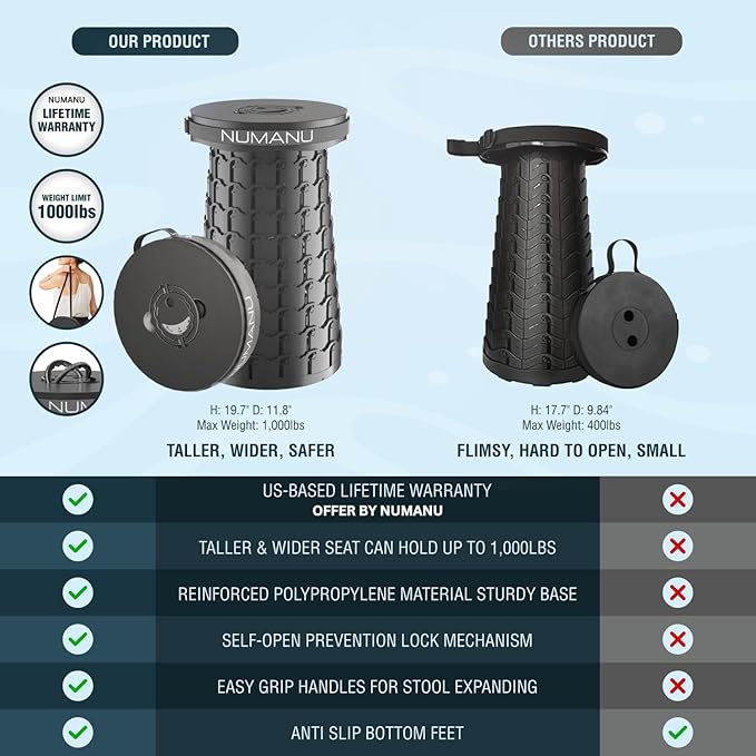 - 🆕【2025 PATENTED, TALLER & WIDER XXL STOOL】Wider, Taller, Thicker, Stronger - An XXL Heavy Duty version of the popular Portable Collapsible Stool Telescoping Chair. 19.7" Tall & 11.8" Wide surpassing other Folding Stools on the market. NUMANU, a US-based seller, provides a safe, sturdy, and comfier seating experience with Lifetime Warranty Coverage in case of any issues with your Retractable Folding Stool.
