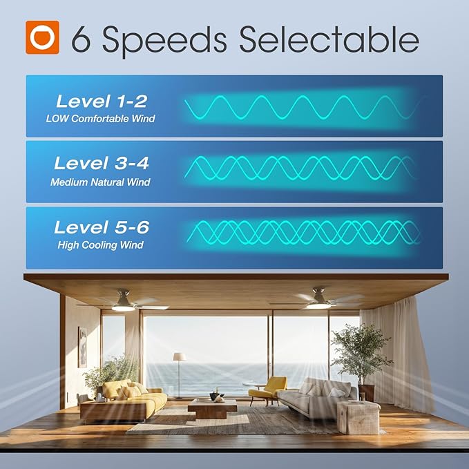 - Reversible DC Motor: The high-quality & high-speed motor brings a perfect wind experience. The wind speed can be adjusted in 6 gears, you can choose between comfortable wind, natural wind and strong wind. Reversible dual-direction fan improves air circulation to keep you warm in winter and cool in summer. Our fan blades are double sided in different colors, one side is nickel and the other side is oak grain. Choose the fan blade color that best fits your home decor!