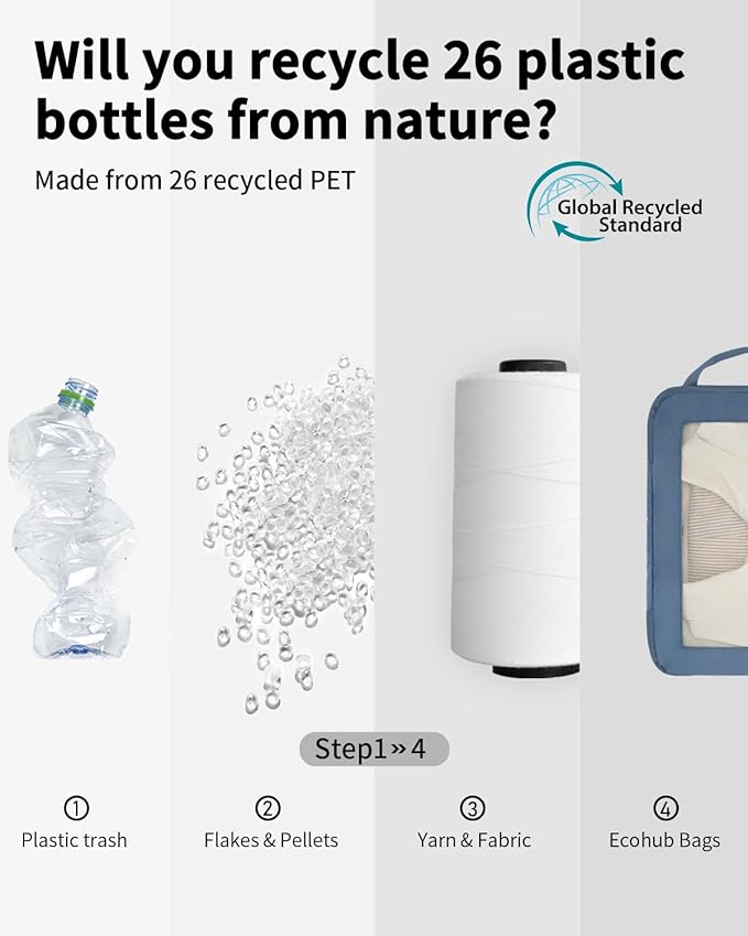 - 【SUSTAINABLE AND GUARANTEE】: ECOHUB travel packing cubes are made from at least 50% recycled materials, with fabric and lining crafted from 26 recycled PET plastic bottles. The lightweight fabric combined with YKK zippers and reinforced ripstop stitching, ensure durability for any adventure. If you have any concerns, reach out through your order. (Patent Pending)