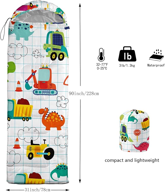 - 【Fits For 3 Seasons】: Size - 31 by 90 inches (W x D). Our Dinosaur Tractors sleeping bag can be used in 3 seasons with a design temperature of 32℉-77℉(0℃-25℃). These Sleeping bags also have a weather resistant waterproof design to keep you warm and prevent you from any dampness.