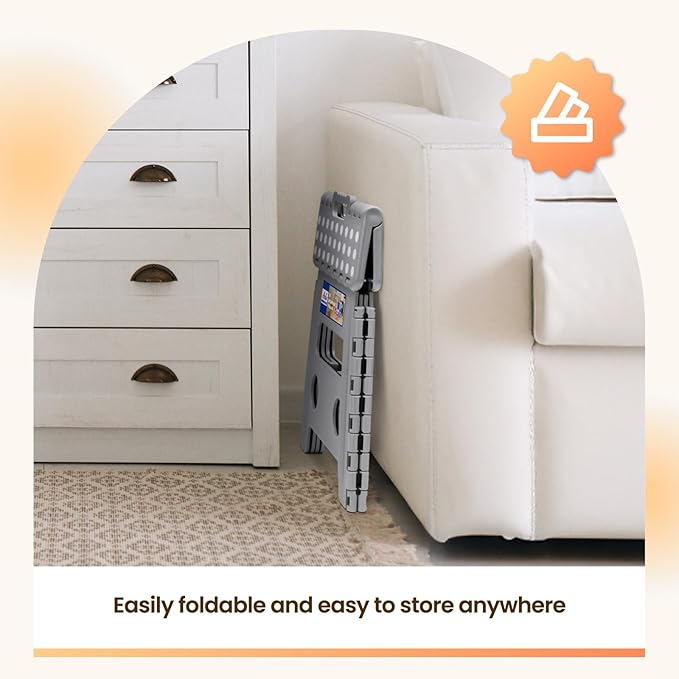 - Compact Design: Folds flat for convenient storage. At 1.5 inches wide and 13 inches tall, it fits almost anywhere yet provides a sturdy 11.2"L×8.5" W step.Anyone wearing a shoe size 17 or less can stand up fully on both feet without worrying that the step stool is too small. Completely suitable for adults.