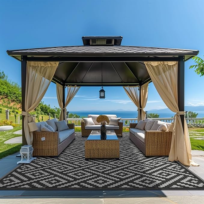 - Extended Lifespan · Dual-Sided Wear Resistance: The GENIMO outdoor rug features a reversible design with two classic geometric patterns, doubling its lifespan through alternating use. The dark-toned surface effectively conceals dirt, stains, and fall debris, maintaining a pristine appearance even in rugged environments. Perfect outdoor patio rugs, RV mats, and camping rugs for indoor-outdoor transition zones—effortlessly switch sides for practicality and timeless decor.