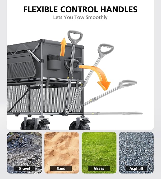 Double Decker Wagon, 480Lbs Capacity, Big Wheels & Side Pocket, Folding Wagon for Shopping, Garden, Camping, Fish - Grey