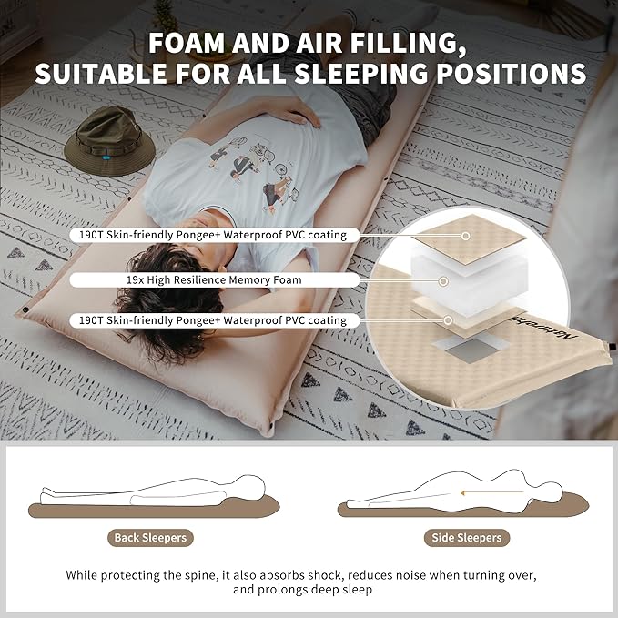 - EXTRA THICK FOAM SUPPORT: Naturehike Self-Inflating Sleeping Pad is made with 19x high resilience memory foam and when fully inflated the sleeping pad can be up to 4 inches/10 cm thick. The combination of foam and air filling evenly distributes the pressure on the air mattress, giving you enough support for every part of your body, yet soft enough to give you the experience of being on a cloud