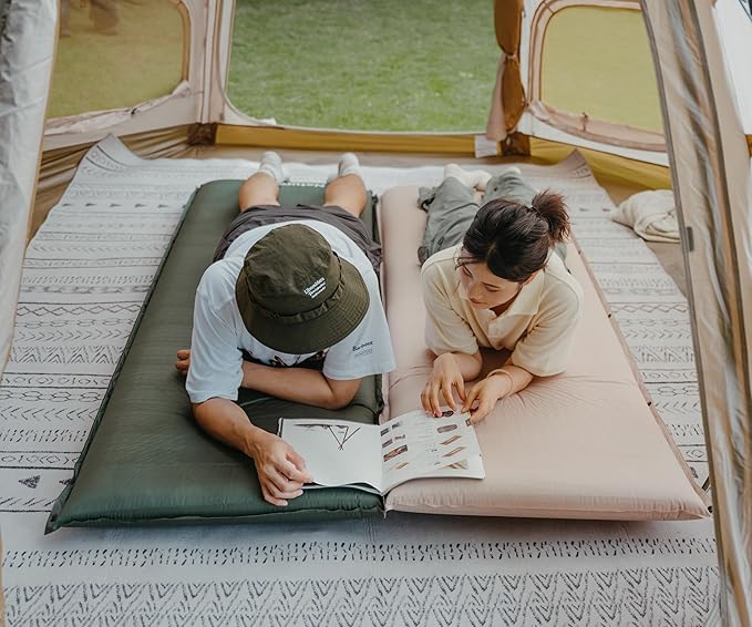 - Faster self-inflation: This sleeping pad has two air nozzles for quicker inflation or deflation. It usually takes about 1-2 minutes to inflate to 80%, then you need to mouth blow or air pump to refill up. The first time you use it or stow it away unused for a long time, it will take more time to recover the elasticity of the foam. The weight capacity of a single air mattress is around 330 lbs. This sleeping pad is suitable for camping/ traveling/ hiking/ home/ tent/ marching bed etc