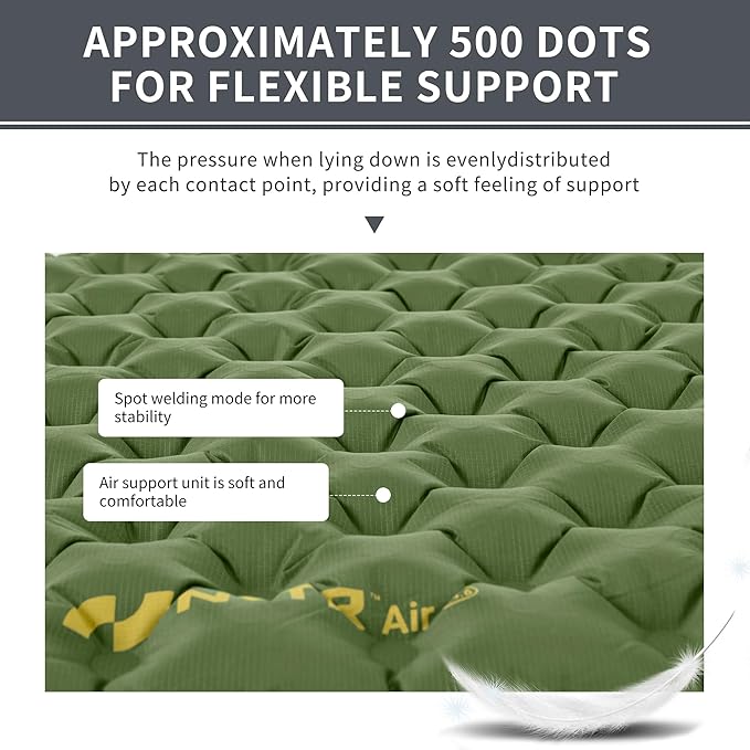 - COMFORTABLE AND STURDY SLEEPING PAD: Punching point structure, providing tough support, the pressure is evenly distributed by each contact when lying down, providing a soft sense of support, the whole soothing relaxation. 71.4 * 22.6inch/183 * 58cm size is enough for you to turn over freely on the air cushion