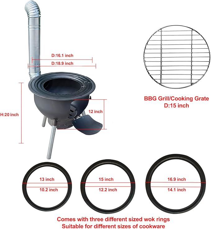 - This outdoor wood stove is equipped with a stainless steel cooking grate (diameter: 15 inches) and can be used as an charcoal barbecue grill .And it is equipped with 3 different sizes of wok rings, so that the stove can use a variety of sizes and functions of cookware (size 11-18 inch), such as seafood boil Pot,stock pot,wok,cast iron skillet, pans,etc., to meet most cooking needs.