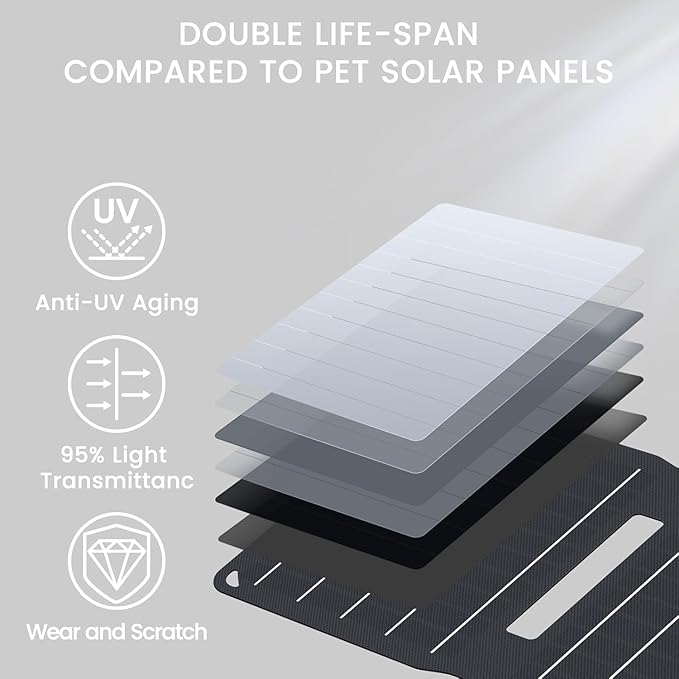 - WATERPROOF DURABLE: IP67 waterproof and EF laminations provides lasting durability to protect against unpredictable weather conditions, and can easily withstand high temperatures. Worry-free off-grid charging, best emergency power device to have. Note: The surface of the solar panel is waterproof, but the output port is not water-resistant. Please do not immerse the panel in water!