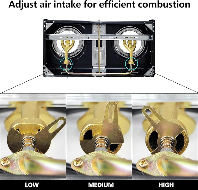 - 【Optimal Thermal Efficiency Propane Burner 】 The Nardea 2 burner propane gas stove offers rapid and even heating with a maximum 17000 BTU output and up to 63% thermal efficiency. Each propane burner includes a air damper adjustment plate for easy gas pressure control, ensuring blue flames for thorough combustion.