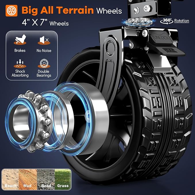 - ใ๐ฏ๐ฒ๐ฌยฐ๐ฅ๐ผ๐๐ฎ๐๐ถ๐ผ๐ป ๐จ๐ป๐ถ๐๐ฒ๐ฟ๐๐ฎ๐น ๐๐น๐น-๐๐ฒ๐ฟ๐ฟ๐ฎ๐ถ๐ป ๐๐ถ๐ด ๐ช๐ต๐ฒ๐ฒ๐น๐ ๐๐ถ๐๐ต ๐๐ฟ๐ฎ๐ธ๐ฒ๐, ๐ฆ๐๐ถ๐๐ฎ๐ฏ๐น๐ฒ ๐ณ๐ผ๐ฟ ๐ฉ๐ฎ๐ฟ๐ถ๐ผ๐๐ ๐ฅ๐ผ๐ฎ๐ฑ ๐ฆ๐๐ฟ๐ณ๐ฎ๐ฐ๐ฒ๐ใThis beach carts features 4 larger and wider 7"x4" double bearings all-terrain big wheels, allowing for flexible steering and smooth rolling on various road surfaces such as mud, grass, and hard sand. The two 360ยฐ rotation front wheels with brakes, effectively to stop and prevent the wagon from moving. It' s shock-absorption and noise-reduction, ensuring durability and resistance to wear and tear.
