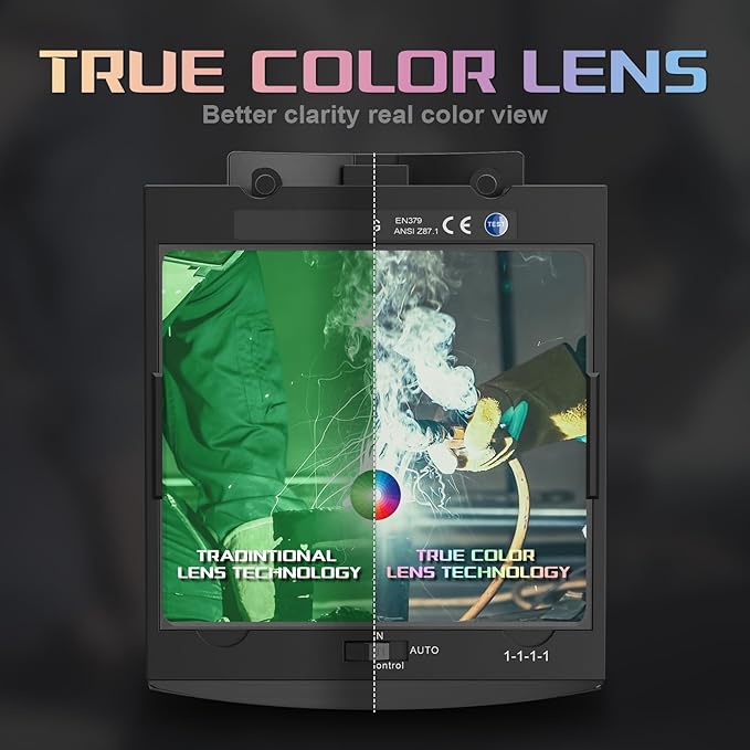 - 【Super Large viewing screen】The 4.31" x 3.82" (16.4 square inch) and side screens (no auto-darkening), combined with exceptional 1/1/1/1 Optical Clarity, guarantees a crystal-clear view, depicting true color views with cinematic quality. Weld with confidence as if you were watching a picture in a movie theater