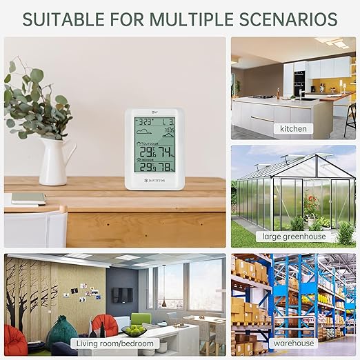 - WIDELY USED AND SATISFACTORY SERVICE: Indoor outdoor thermometer wireless Whether in homes,daycare centers,basements,or warehouses,this monitor can provide necessary temperature and humidity control to help you maintain a healthy and comfortable environment. If you encounter any problems in the inside outside thermometer use process, please let us know at any time, and we will provide satisfactory after-sales service within 24 hours !