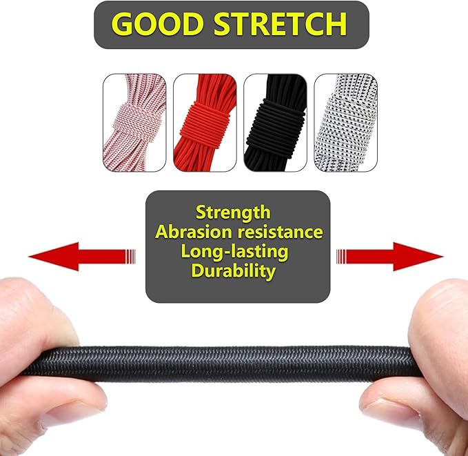 - GOOD STRETCH:The interior is composed of natural latex rubber, and the exterior is tightly wrapped by polypropylene.Our shock cord has better performance in strength,long-lasting,abrasion resistance, and durability.