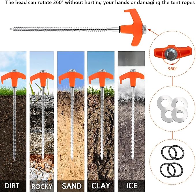 - 【Simple Installation】These screw in stakes with pointed tips is easy to insert into the grass, dirt, hard soil, and gravel. The metal threaded tent spikes offer a stronger grip in windy conditions. With the help of a cordless drill or impact driver, ground anchors will make your tents, canopy, awning, tarps, and grasp the ground more stable and reliable.