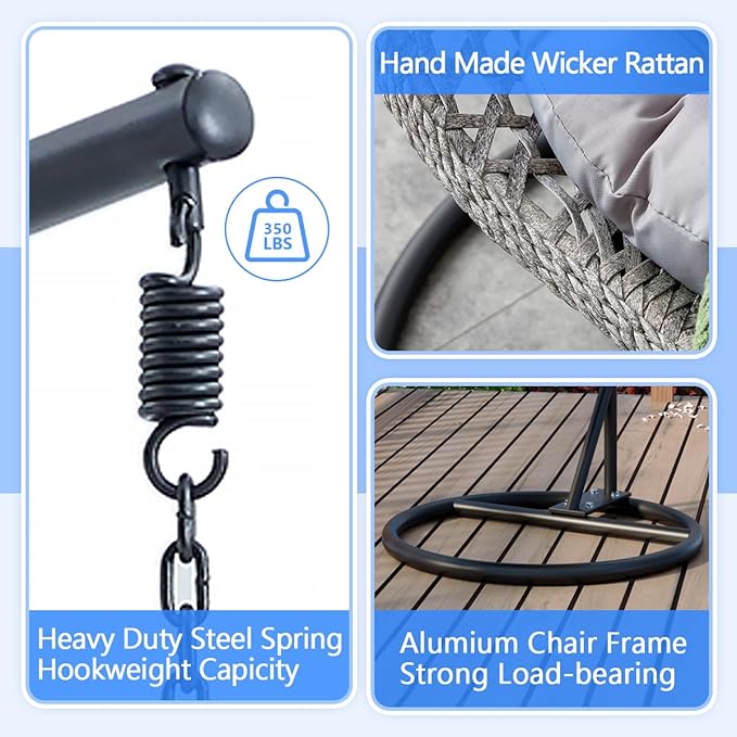 - 【Indoor Outdoor Egg Swing Chair】The egg chairs have an aluminum-steel frame and a strong heavy-duty steel stand. This means the chairs won't get rusty and will last a long time. Also, the stand is very stable and can give steady support on any kind of ground.The swing chair can play a very good decorative role in indoor and outdoor places. It is very simple to move and is very suitable for living rooms, bedrooms, porches, gardens.