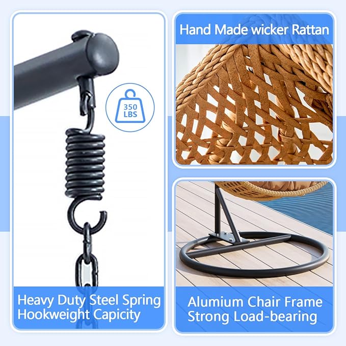 - 【Indoor Outdoor Egg Swing Chair】The egg chairs have an aluminum-steel frame and a strong heavy-duty steel stand. This means the chairs won't get rusty and will last a long time. Also, the stand is very stable and can give steady support on any kind of ground.The swing chair can play a very good decorative role in indoor and outdoor places. It is very simple to move and is very suitable for living rooms, bedrooms, porches, gardens.