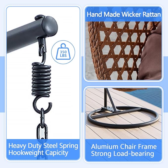 - 【Indoor Outdoor Egg Swing Chair】The egg chairs have an aluminum-steel frame and a strong heavy-duty steel stand. This means the chairs won't get rusty and will last a long time. Also, the stand is very stable and can give steady support on any kind of ground.The swing chair can play a very good decorative role in indoor and outdoor places. It is very simple to move and is very suitable for living rooms, bedrooms, porches, gardens.