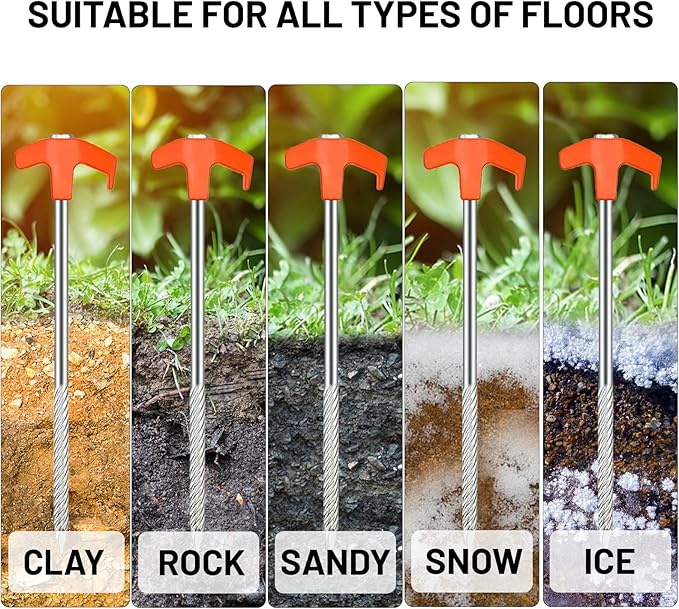- Stronger Grip: we adopted metal thread design for heavy duty tent stakes, the spiral pattern allows you to enhance the soil grip after screwing in and prevent it from loosening or sliding out of the ground, suitable for a wider selection of soils, it's a good choice to use it as an outdoor camping tool.
