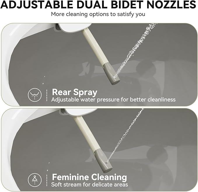 - Personalized Nozzle: The bidet nozzle ergonomic water jet design, and you can adjust the nozzle water pressure according to personal preferences. The rear and feminine washing modes provide a refreshing cleaning and nursing experience.