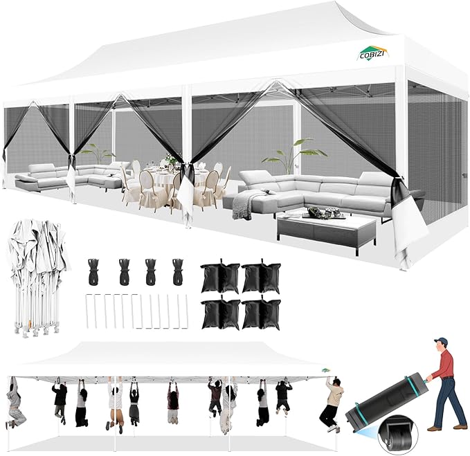 COBIZI 10x30 Canopy Tent with 8 Sidewalls,Heavy Duty Pop up Canopy Party Tent with Mosquito Netting,Easy up Screen Canopy for Parties Wedding Outdoor Patio with Roller Bag,Sandbag,White