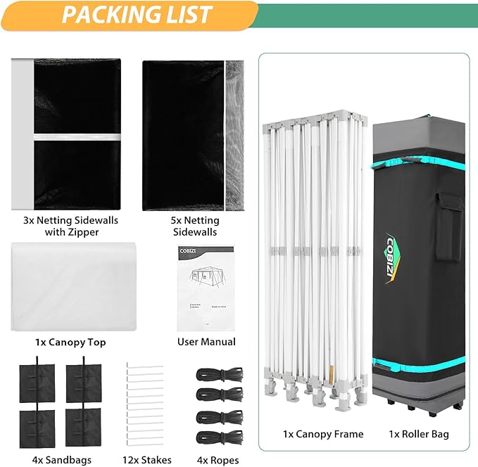 - 【Packing List】The 10x30 canopy package contains 1 heavy duty frame, 1 420D Oxford cloth top cover, 8 mesh sidewalls, 4 sandbags, 12 ground spikes, 4 ropes, 1 roller bag and 1 instruction manual. If there are any missing or damaged accessories when you receive it, please contact us for replacement.