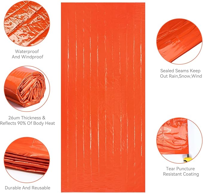 - Ultra-bright Reflective Surface: Trapped in the dark? Let this Survival Blanket Bag light the way. The bright orange emergency sleeping bag and its reflective surface will provide crucial visibility and help first res-ponders find you.