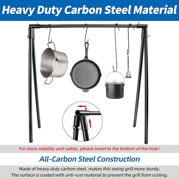 - [All Carbon Steel Material]-Our campfire swing cooking grill stand is made of heavy duty carbon steel, covered with anti rust material, makes it more durable and sturdy, high temperature resistant, can be directly used in campfire.