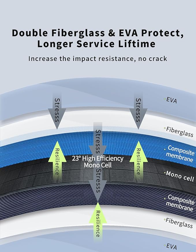 - 【Durable Material for All Weather】GreenMagic flexible solar panel surface is made of IP68 waterproof ETFE material, which can resist extreme weather such as high temperature, freezing, sandstorms, and rainstorms. And the component contains a bypass diode ,uses input over current protection and reverse protection design.