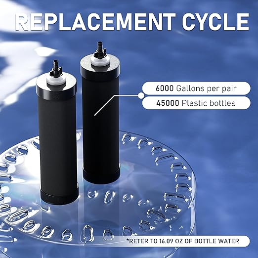 - ECONOMICAL AND LONGER LIFESPAN :The two carbon filters (black) can effectively filter up to 6,000 gallons of water.this water filter system can help save over 45,000 plastic bottles (16.9 oz), protect the environment and reduce plastic waste while providing high-quality purified water