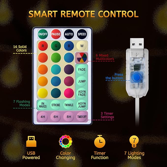- Special Feature : 16 Solid Colors + Multicolor, Remote Controlled, Timer, USB Powered