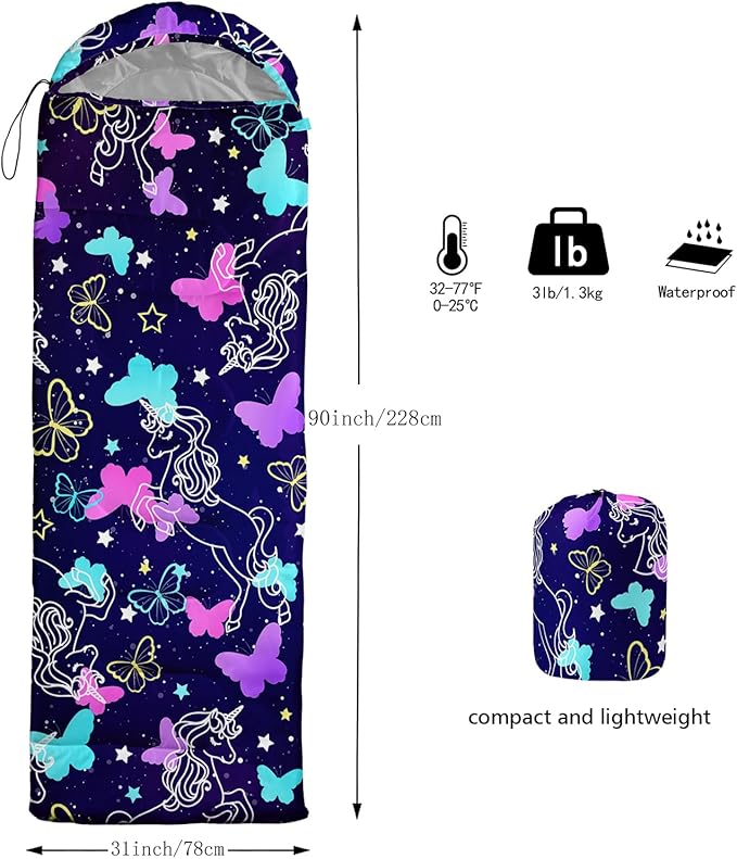 - Applicable For 3 Seasons: Our butterflies sleeping bag can be used temperatures ranging from 32°F-77°F Except for the cold winter,sleeping bag have weatherproof to prevent from dampness,Size is 31 x 90 inches