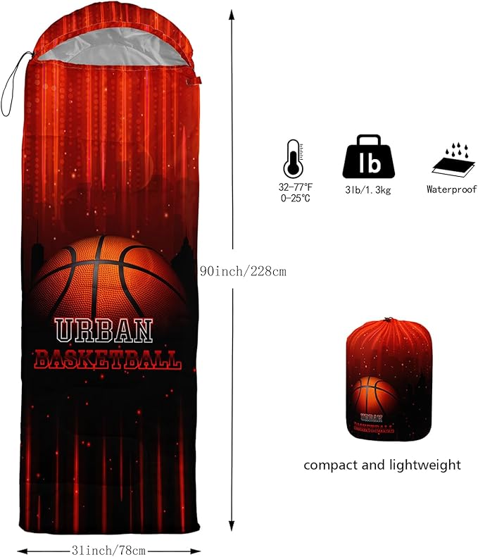 - Applicable For 3 Seasons: Our basketball sleeping bag can be used temperatures ranging from 32°F-77°F Except for the cold winter,sleeping bag have weatherproof to prevent from dampness,Size is 31 x 90 inches