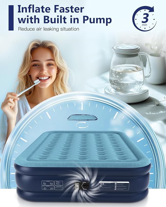 - Quick Inflate Technology - Enjoy effortless setup with our advanced queen air mattress raised featuring a 110V built-in pump that inflates and deflates in just 3 minutes. Say goodbye to manual pumping ensuring a seamless experience.