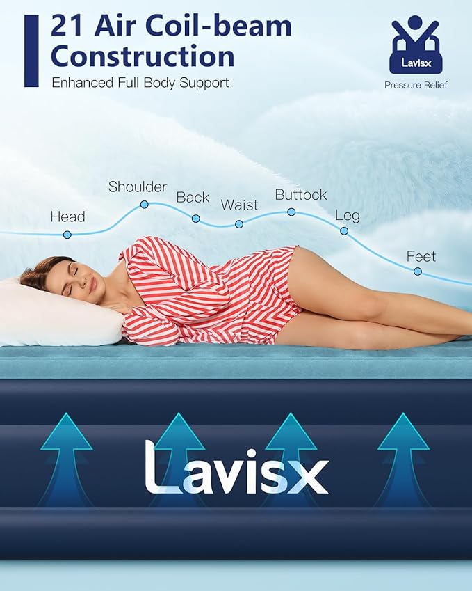 - Advanced Support System - Featuring an innovative coil structure, our inflatable mattress delivers superior support and comfort. The carefully designed 21-coil system, allowing you to sleep more naturally and wake up refreshed.