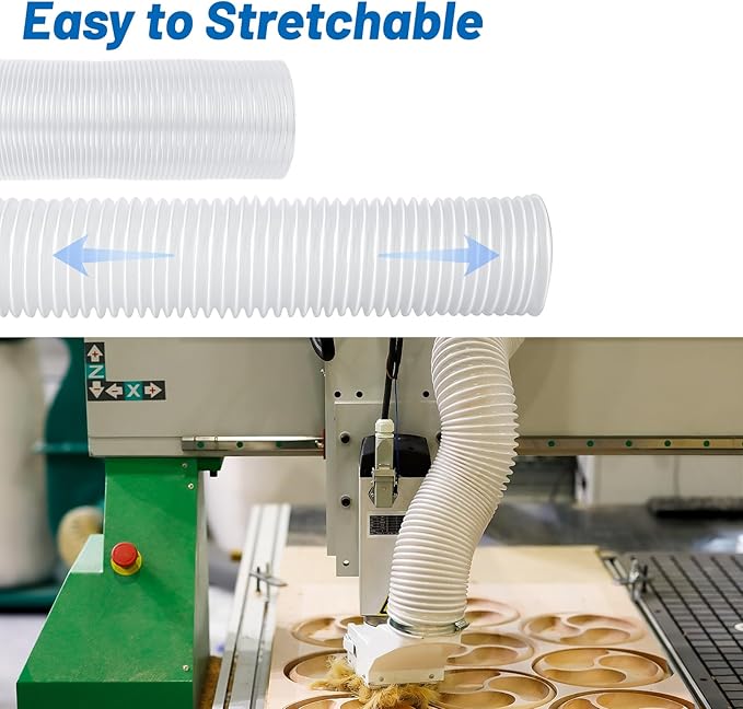 - Thickened PVC material: The PVC fume collection hose is made of thickened PVC material, making it itself super-strong puncture resistance which can withstand various dust and debris generated by cutting, milling or sanding the wood during use without being pierced, and it can also handle the smallest sawdust without leaking.