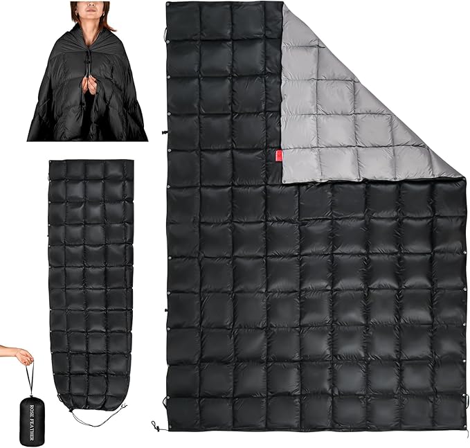 - 【Outdoor Down Camping Blanket】ROSE FEATHER down portable backpack blanket can keep you warm and cozy no matter where you are. It can also be used as a sleeping bag alternative or supplement, or wearable blanket to accompany you on napping outside, camping, backpacking, hiking, beach or festivals, or to rest on the sofa in the afternoon.