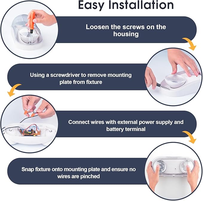 - ✔【Wet Location Rated & Fully Adjustable Two Heads】The Wet Location emergency light with removable waterproof EVA foam protective covers prevent most water,UL-94V-0 Flame-retardant and high impact thermoplastic emergency light available in Wet location with seamless silicon gasket.360 degree rotation Adjustable lamp heads allow this emergency light to be pointed in any direction needed.