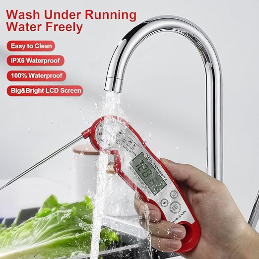 - [Waterproof and Durable] - IP65 rated waterproof, the thermometer can be washed under running water without fear! With a strong ABS plastic body, it can withstand accidental drops or other impact accidents. And features a magnetic back to allow for placement on any metal surface or use the hang hole for hooks.