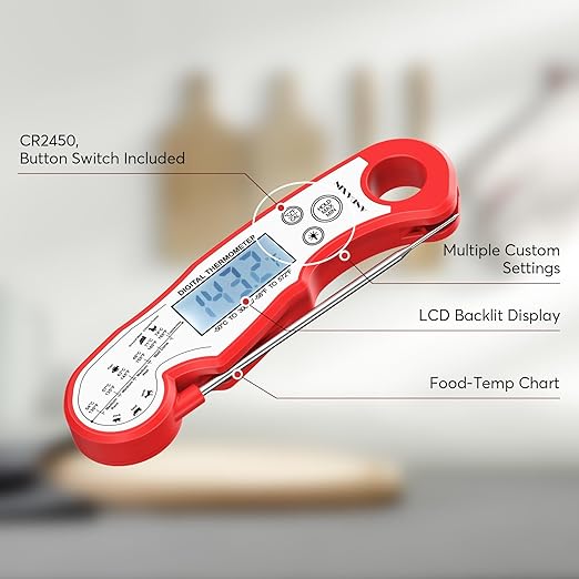 - [Backlight display] - Grilling thermometer features backlight LCD display to let you see clearly while cooking in the evening, indoors or outdoors.