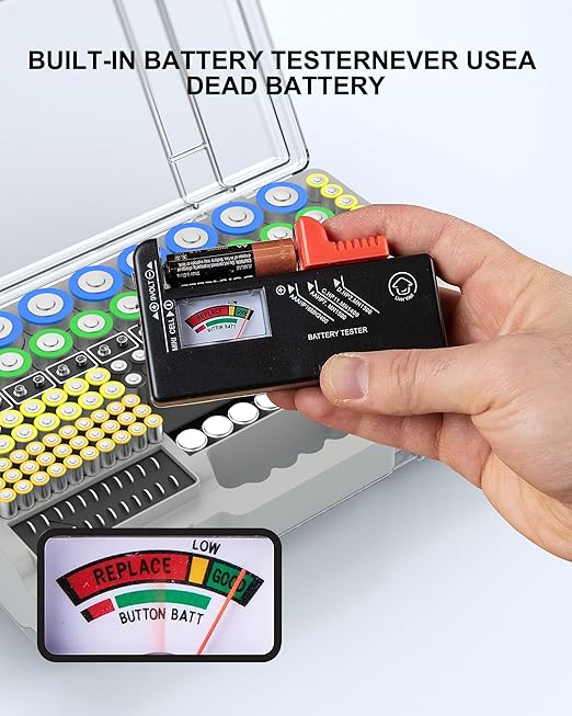 - 5. Battery organizer kit with battery tester BT-BT168:The battery box comes with a battery checker that can help you quickly test whether the battery pack is in good condition, classify it according to the battery life, and make it easier for you to use them better. Home essential, fully meet your needs, worth having, warranty 1 year strong after-sales service, but also questions at any time contact us.