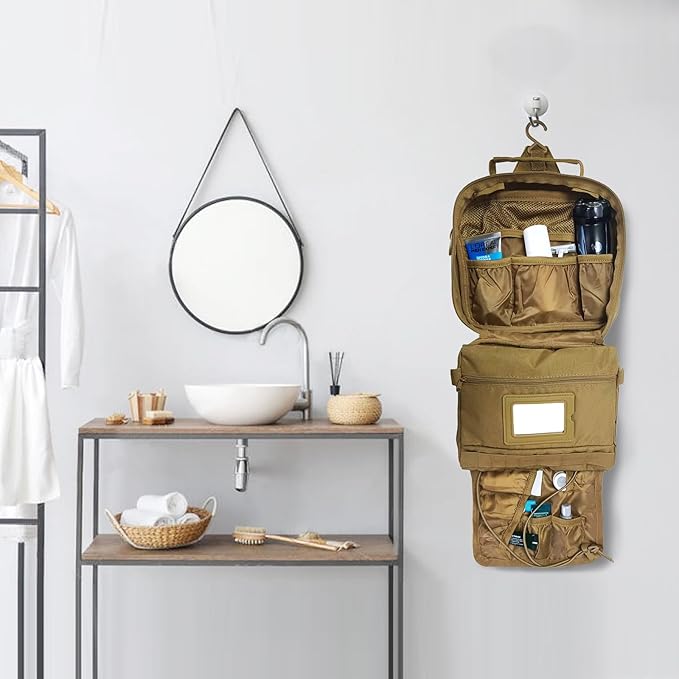 - Multi-Functional Hanging Toiletry Bag for Men - Built-In 360° Rotating Hook for Bathroom/Campsite Use + Front MOLLE Panel Compatible with Carabiners & Accessories, Back Zipper Pocket Secures Valuables.