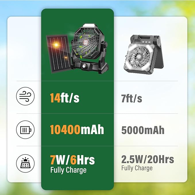 - 🌞【7W High Efficiency Solar Panel】- The solar panel is covered by monocrystalline silicon solar cells, the solar panel adopts multi-layered cell technology to generate energy from the sunlight and perform better with higher conversion efficiency that up to 23% than other conventional panels, and it only takes 6 hours to fully charge the 10400mAh camping fan.