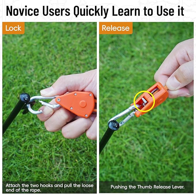 - 3. Easy Lock and Release:Simply attach the hooks, pull the rope tight, and the system automatically locks in place. Releasing is just as easy—press the Thumb Release Lever for a smooth, hassle-free disengagement