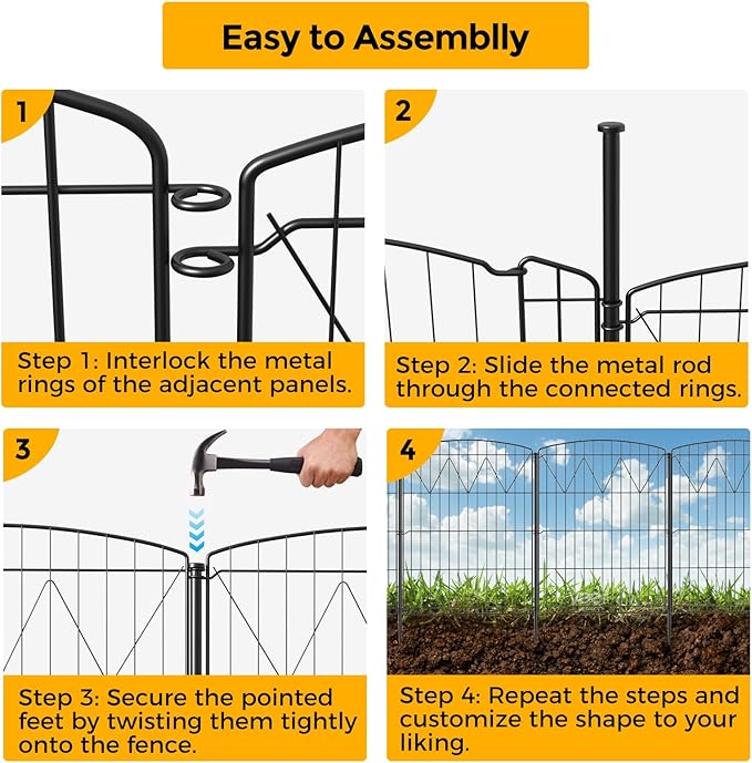 - 【Easy Installation】- No dig fence panels. Jocoevel garden fence features a unique snap circle design for a no-dig setup. Each panel connects effortlessly with overlapping snap circles. Just align the circles, insert the metal posts, and hammer them in for secure placement. Enjoy a sturdy, beautiful fence without the hassle of traditional installation!