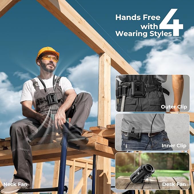 - 4 Hands-Free Wearing Styles: The waist fan offers outer and inner clips for use as a belt fan or undershirt fan. It can also be hung around the neck with the included lanyard. With the fan stand, it can be placed on a table. Four wearing options, hands are completely free
