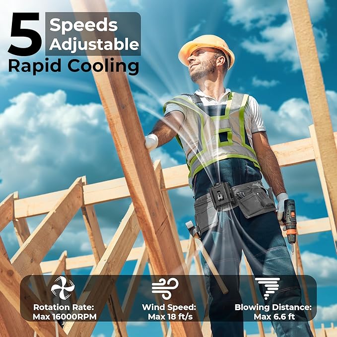 - 5 Adjustable Wind Speeds: The jobsite fan offers 5 wind speeds, equipped with a high-speed brushless motor with a maximum speed of 16000RPM and blows at most 18ft/s strong airflow, cooling down in a second. Perfect for workers who need the strong wind in high-temperature environments