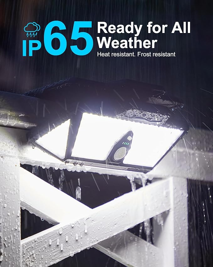 - High Brightness Motion Sensor Lights for Outside: Equipped with 208 LEDs,solar motion lights outdoor waterproof can provide a high brightness lighting (1000 lumen with white lighting color) which can cover a range of up to 26ft and 300 degree angle