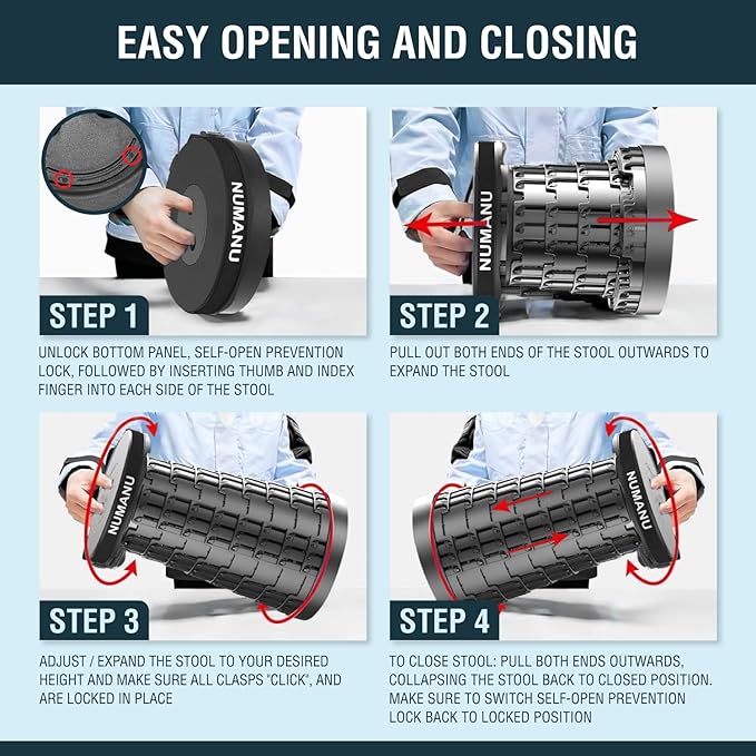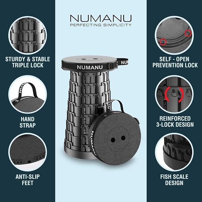 - 🔒【SELF-OPEN PREVENTION LOCK】Most Telescopic Stools cannot properly lock and many times slip out unexpectedly while Collapsed/Closed – Rest assured your NUMANU Telescoping Travel Foldable Chair is always securely locked in place with our open-prevention Safety Lock.