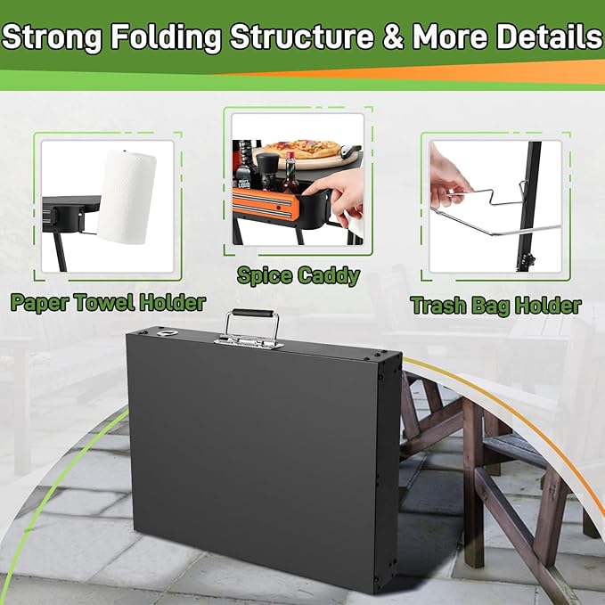 - Multifunctional Set of Grill Table: You can arrange as many seasonings as you like in the grill caddy, that will make the meat more delicious! The paper towel holder makes the paper towel within reach. The new magnetic suction sector gives your spatula a home. Four hooks can be placed at will towels, and barbecue utensils, within reach, so that you can release your hands. Attentive to the beer opener, to open the grill's tasty!